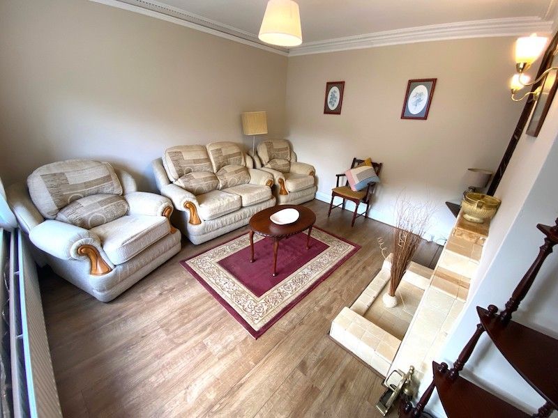 The Front Garden is set out attractively in lawn partly front and side with remainder bordered with path way and stone feature and scrubs. See photos shown to explain current situation. The plot is bordered by way of dwarf walling and mature hedging with small steel gates to front leading to driveway and Garage.