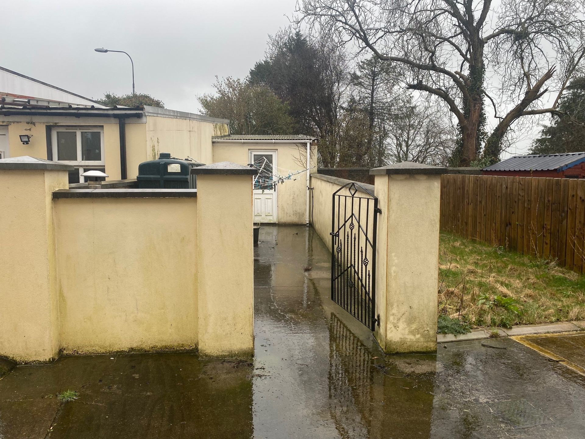 - Private Outdoor Space: Walled rear yard with a concrete storage shed.