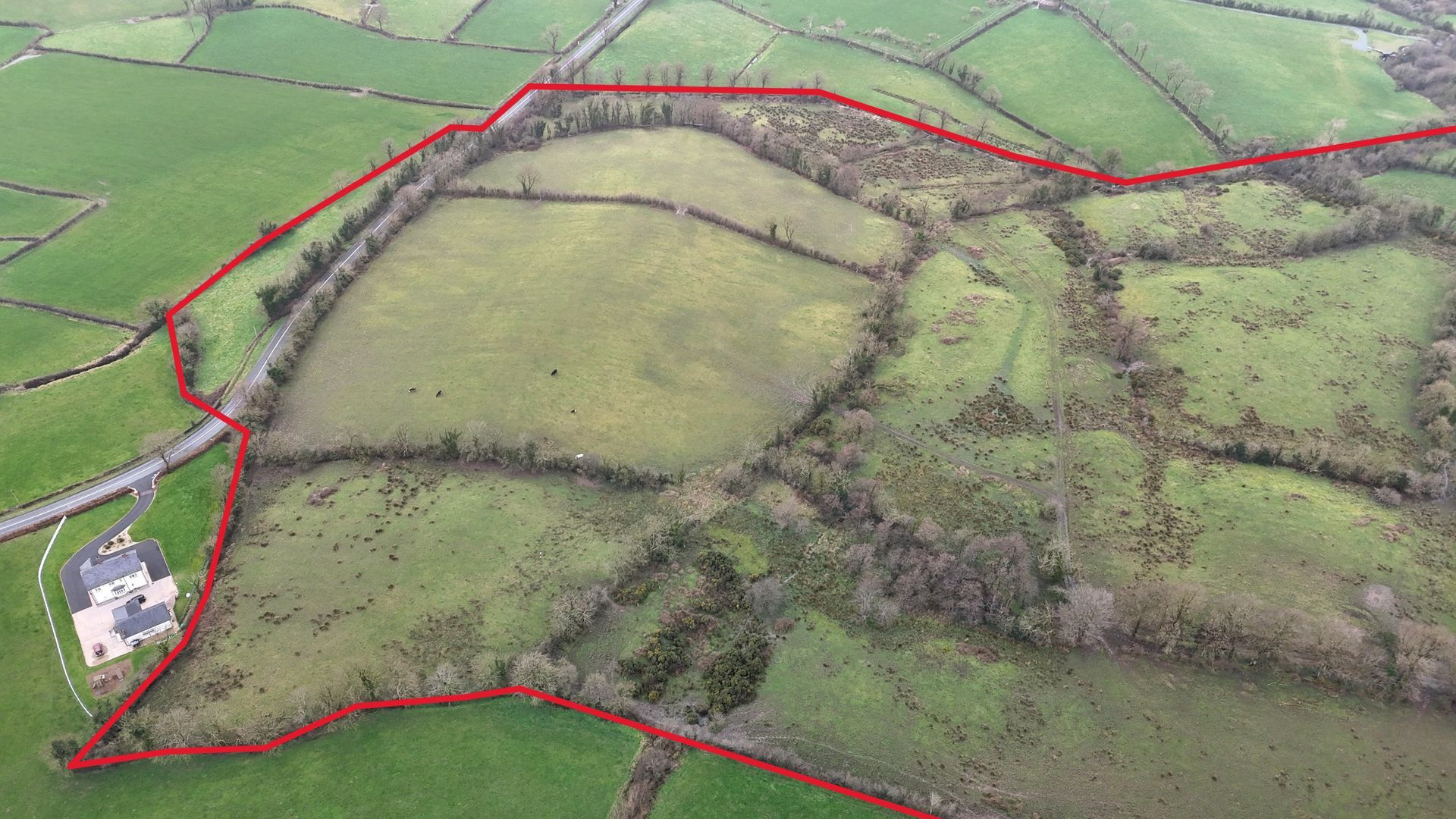 The lands are defined by mature natural hedgerow, post-and-rail fencing,. Hedgerows provide excellent shelter for livestock. Bordering the southern portion of the farm is a small fresh water stream.